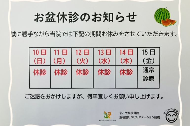 今年のお盆休みは8月10日(日)~8月14日(木)までです。